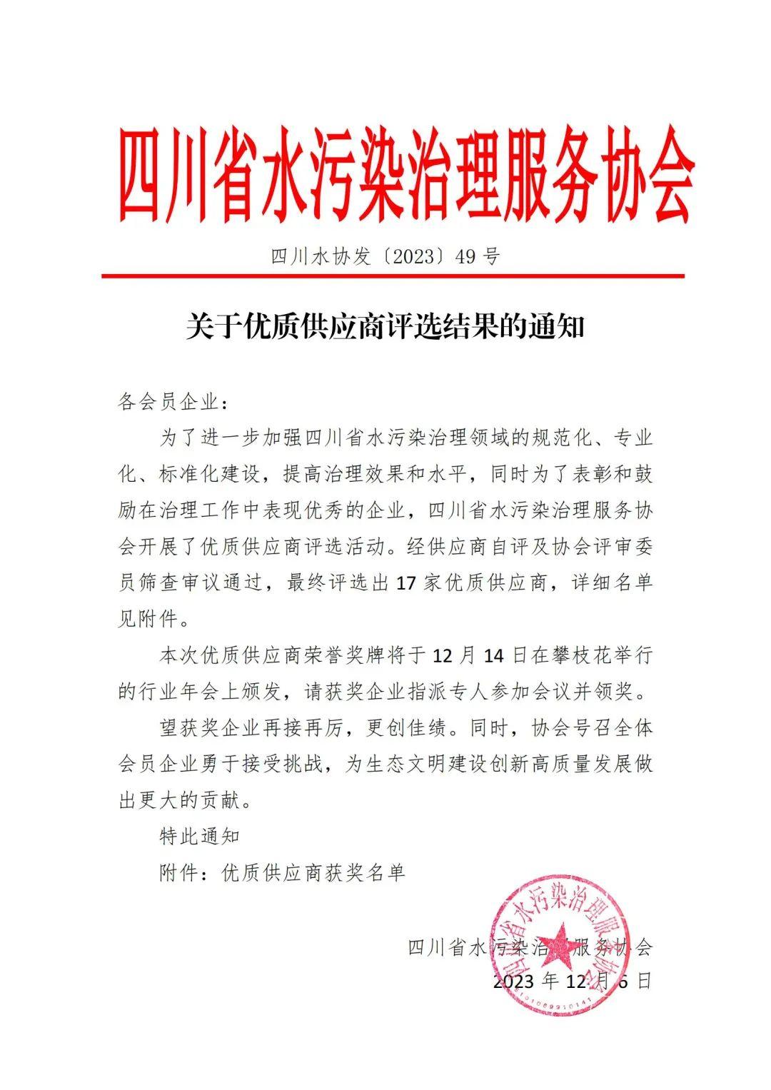 四川省水污染治理服務協會評選出的17家優質供應商中,有幸看到了我們的名字!