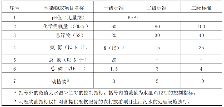 b) 根據污水處理設施出水直接排入的水域功能類別和設計處理規模,將農村生活污水處理設施水污染物排放標準劃分為一級標準、二級標準和三級標準,各級標準的適用情況見表 1。其中, 岷江、沱江流域重點控制區域內(參見附錄A),設計處理規模 20 m3/d(含)以上的農村生活污水處理設施對應表 1 所列標準上調一級(最高不得超過一級標準);