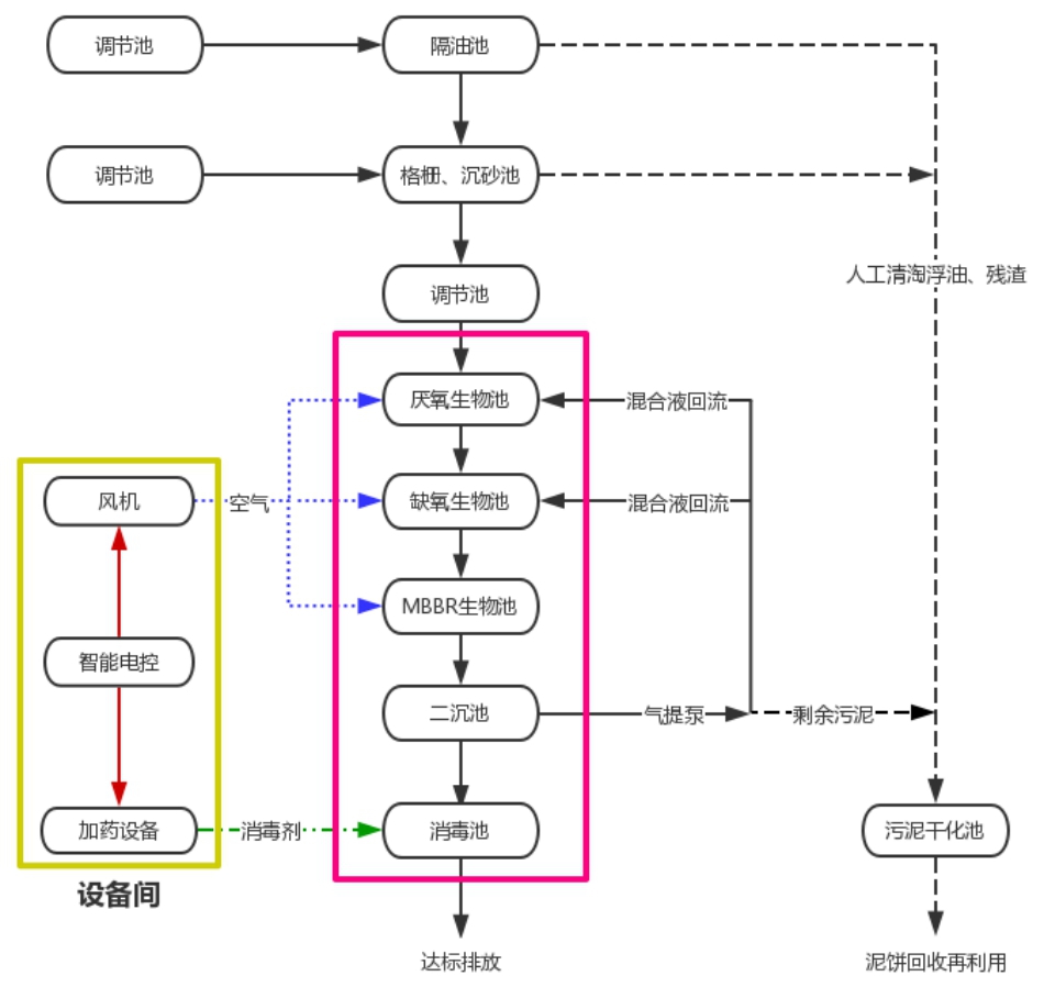1 隔油池:廚房含油廢水排入隔油池,對(duì)污水進(jìn)行隔油預(yù)處理,有助于后續(xù)處理工藝的正常運(yùn)行;